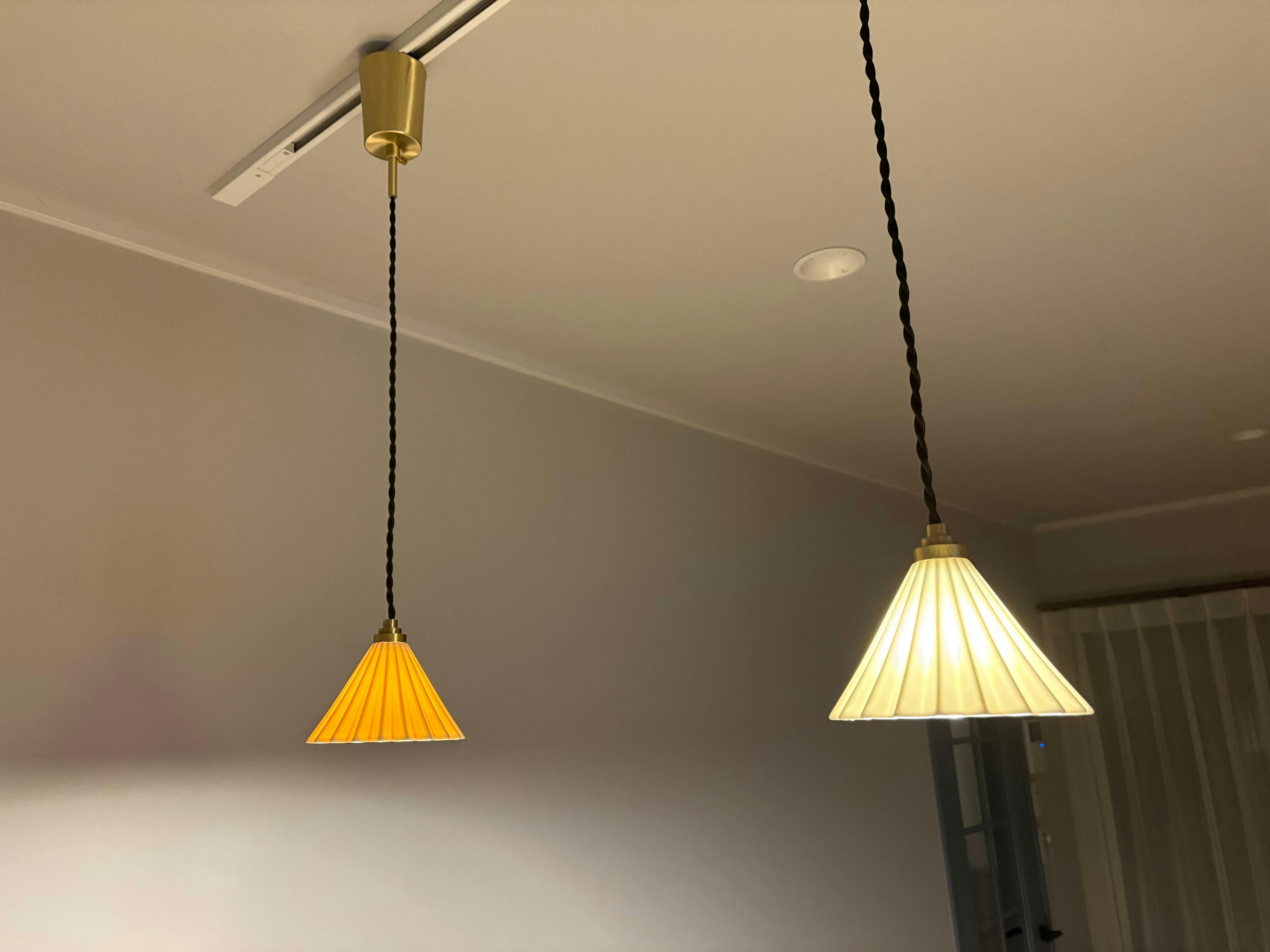 ダクトレールの照明がなかなか決まらず、壁紙が柄物なのでオシャレで主張し過ぎず日本制の照明を探していました。